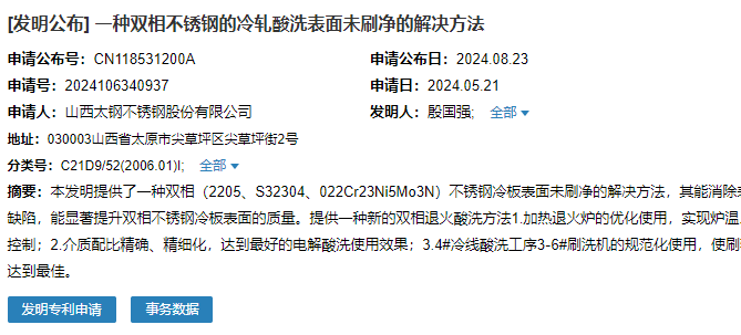 2024年8月23日,山西太鋼不銹鋼股份有限公司成功申請一項名為“一種雙相不銹鋼的冷軋酸洗表面未刷凈的解決方法”專利,申請公布號為CN118531200A,申請日期為2024年5月21日。