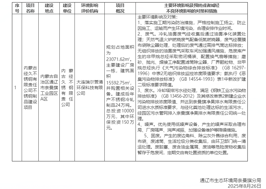 8月26日,通遼市生態環境局奈曼旗分局發布了《關于內蒙古經久不銹鋼有限責任公司不銹鋼制品建設項目(報告表)擬審批公示》。