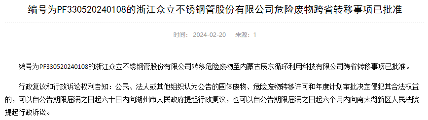 2月20日,湖州市生態(tài)環(huán)境局就浙江眾立不銹鋼管股份有限公司轉(zhuǎn)移危險廢物至內(nèi)蒙古辰東循環(huán)利用科技有限公司跨省轉(zhuǎn)移事項作出批準(zhǔn)。